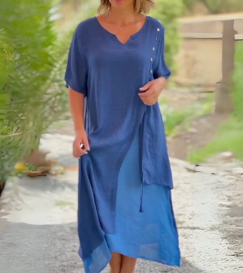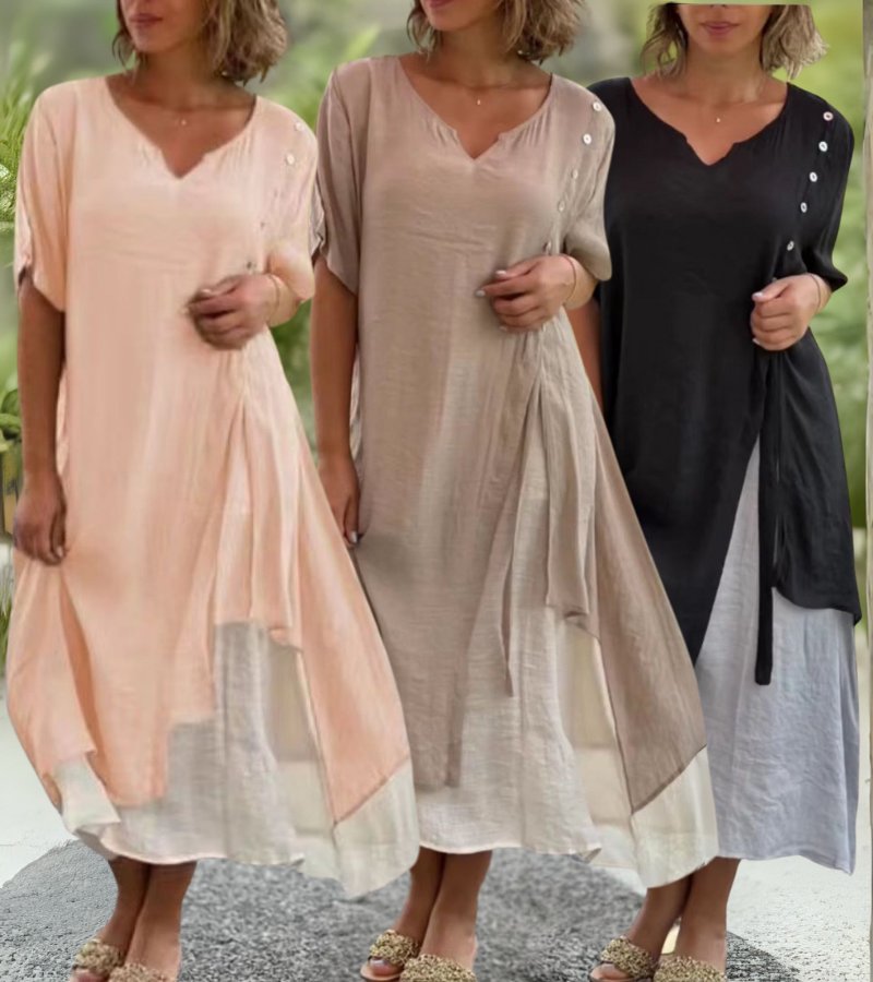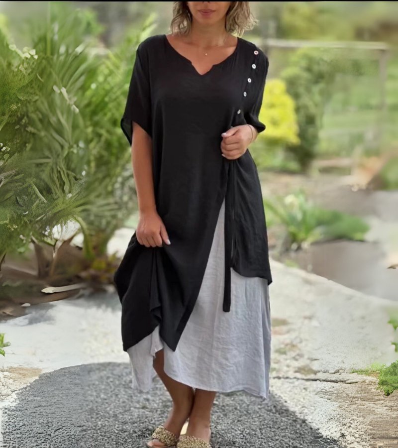 Scopri il fascino dell’eleganza semplice con questo abito asimmetrico effetto 2 in 1.