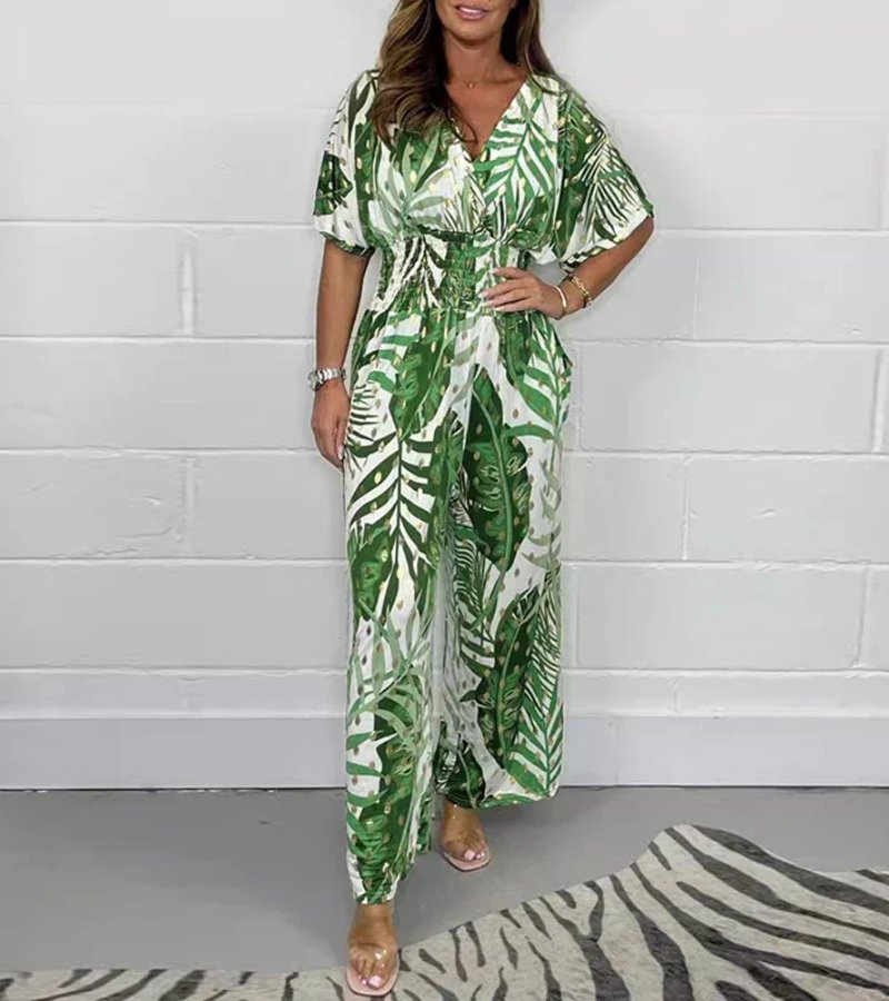 Resta elegante e comoda per tutta l’estate con questa tuta taglie comode a stampa tropicale.