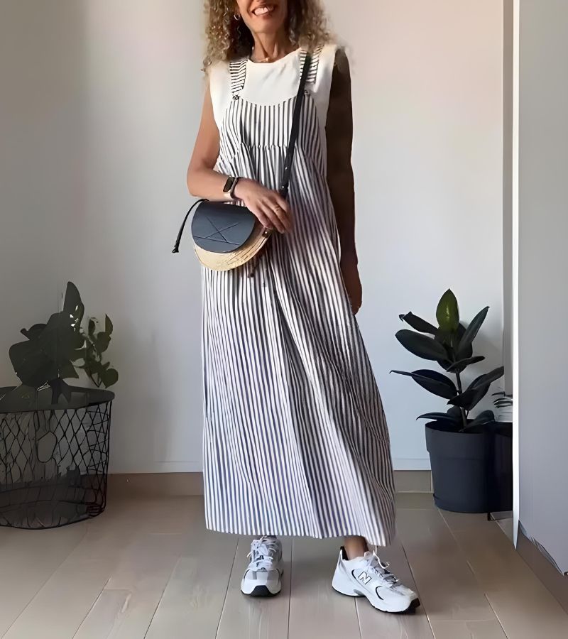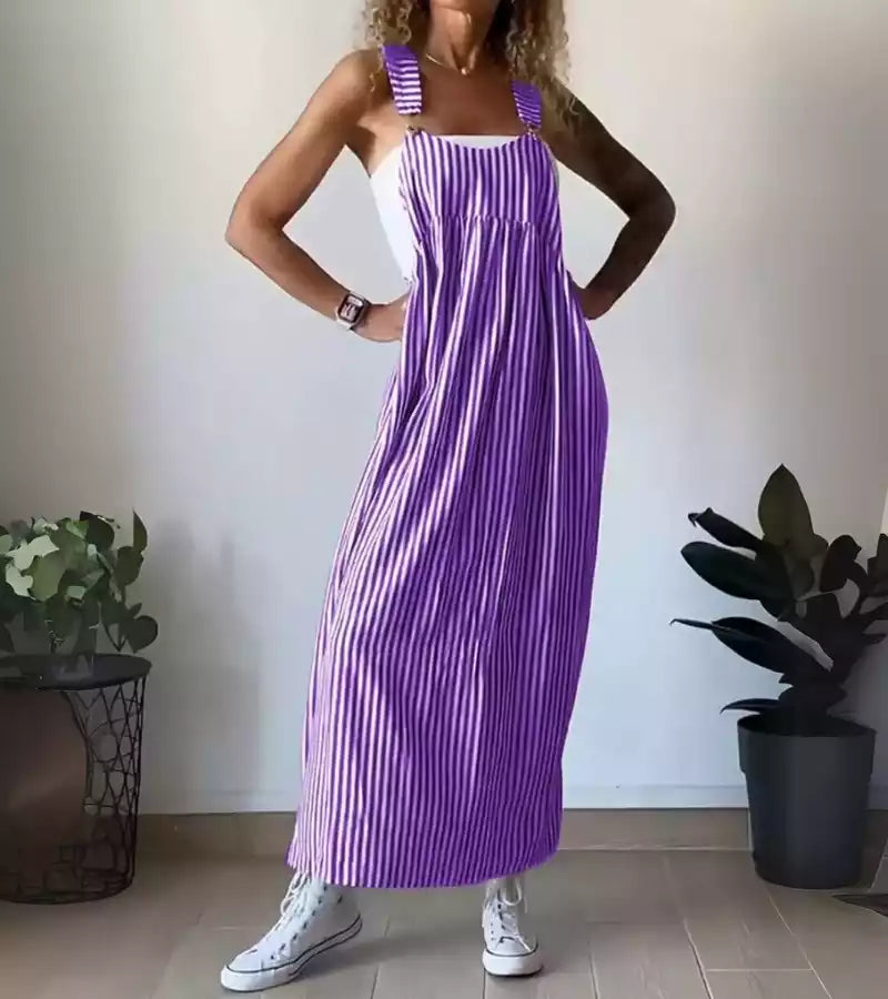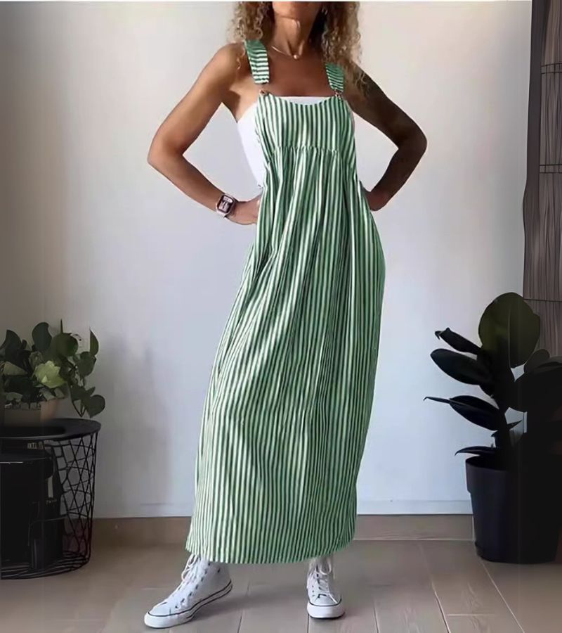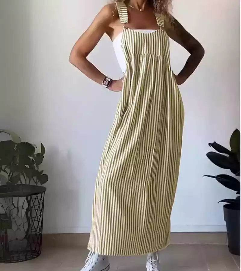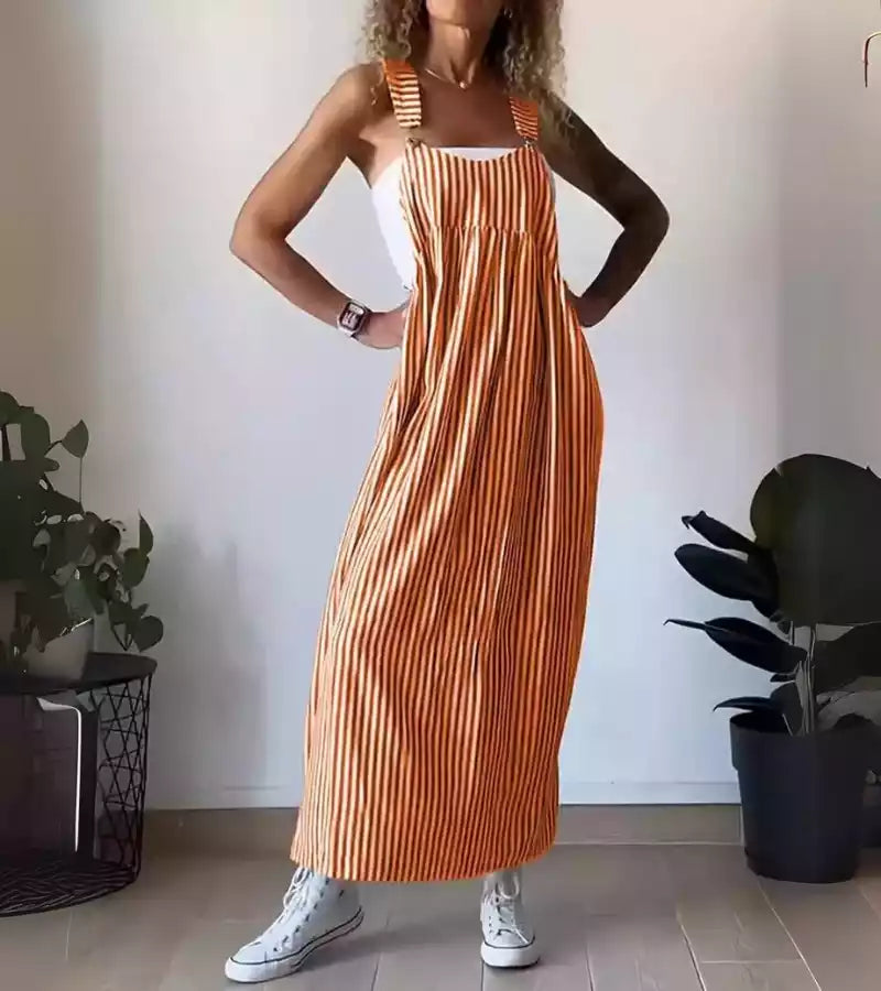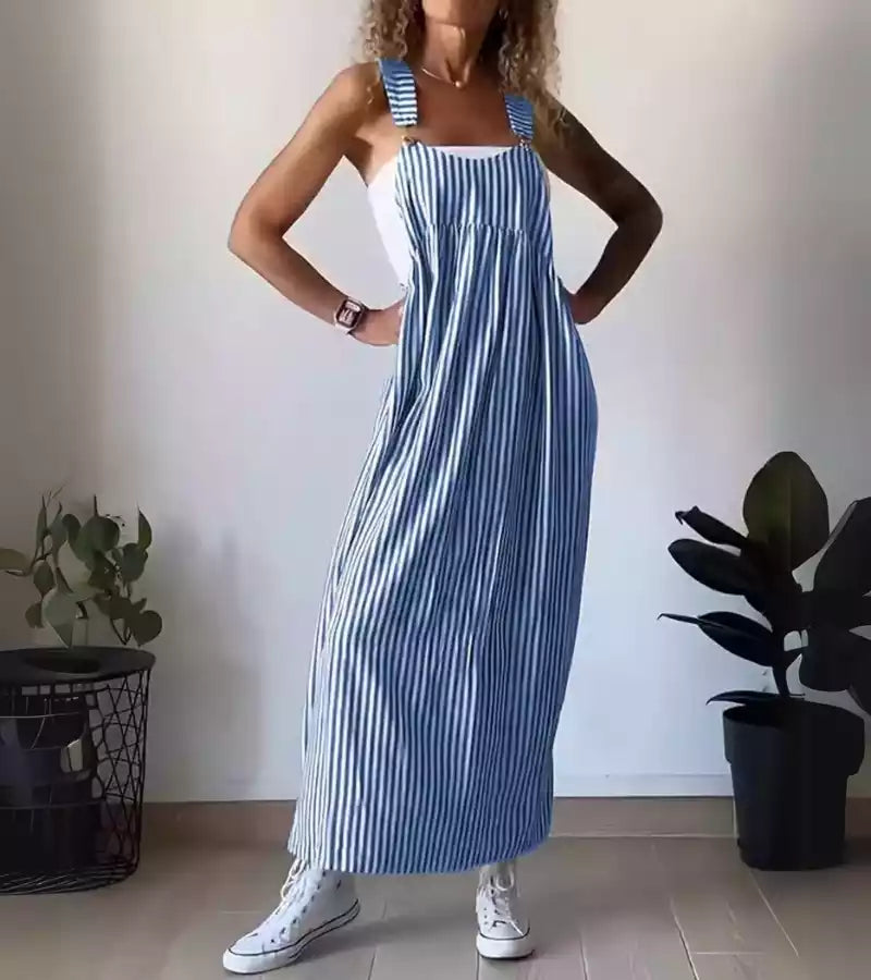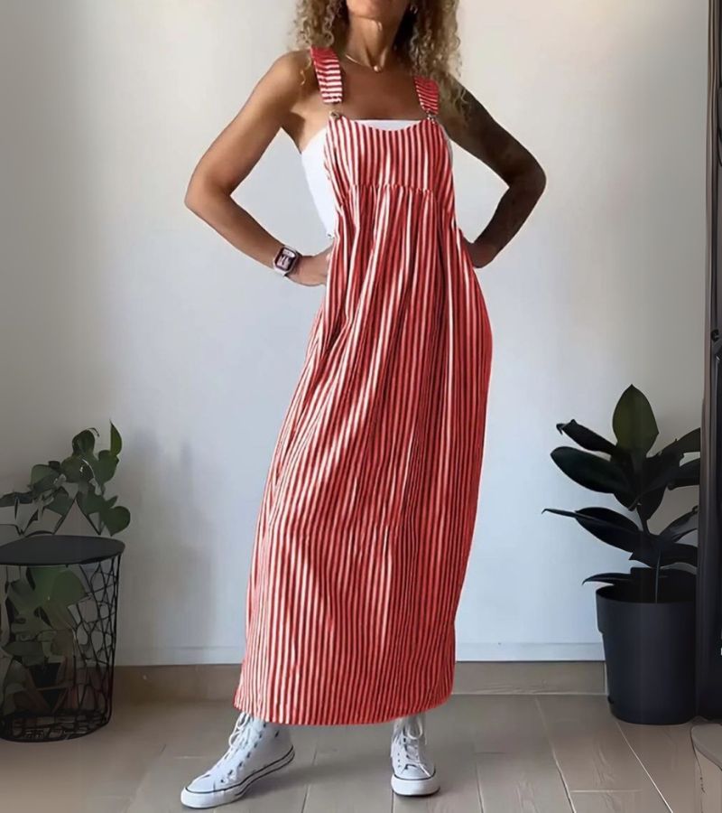 Scopri questo abito lungo a righe ultra leggero, perfetto per le giornate estive. La sua vestibilità ampia e le spalline larghe valorizzano ogni silhouette con comfort e stile. Realizzato in tessuto fresco e traspirante, è l’ideale per restare comoda tutto il giorno. Abbinalo a sneakers o sandali per un look casual ma chic.