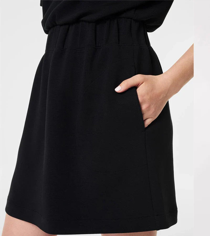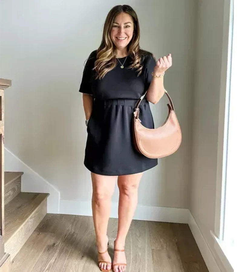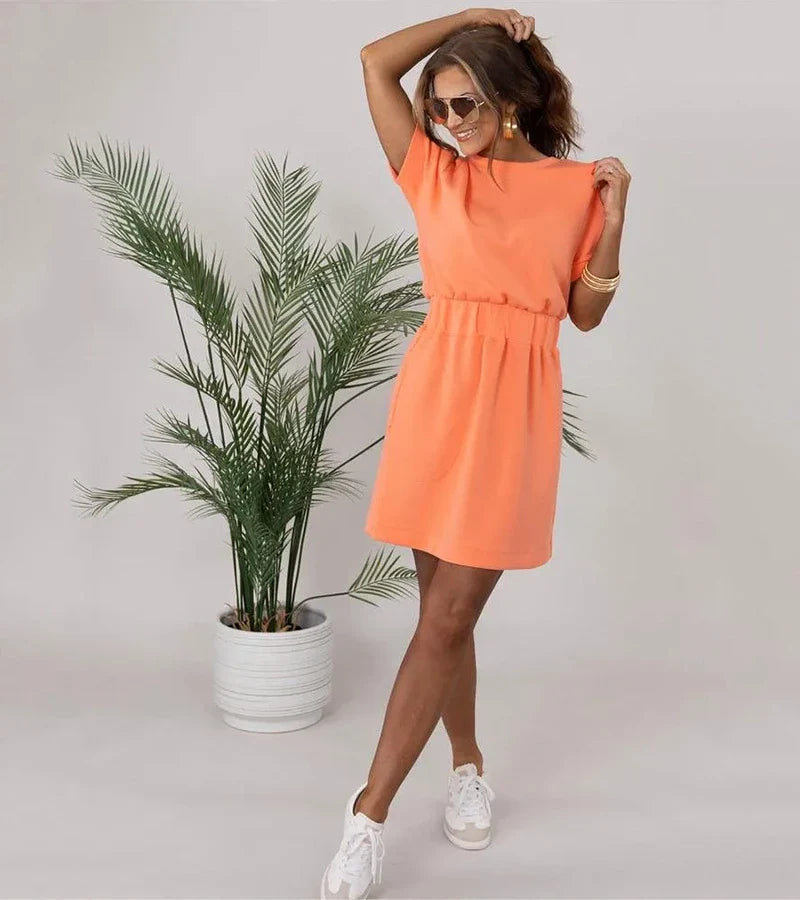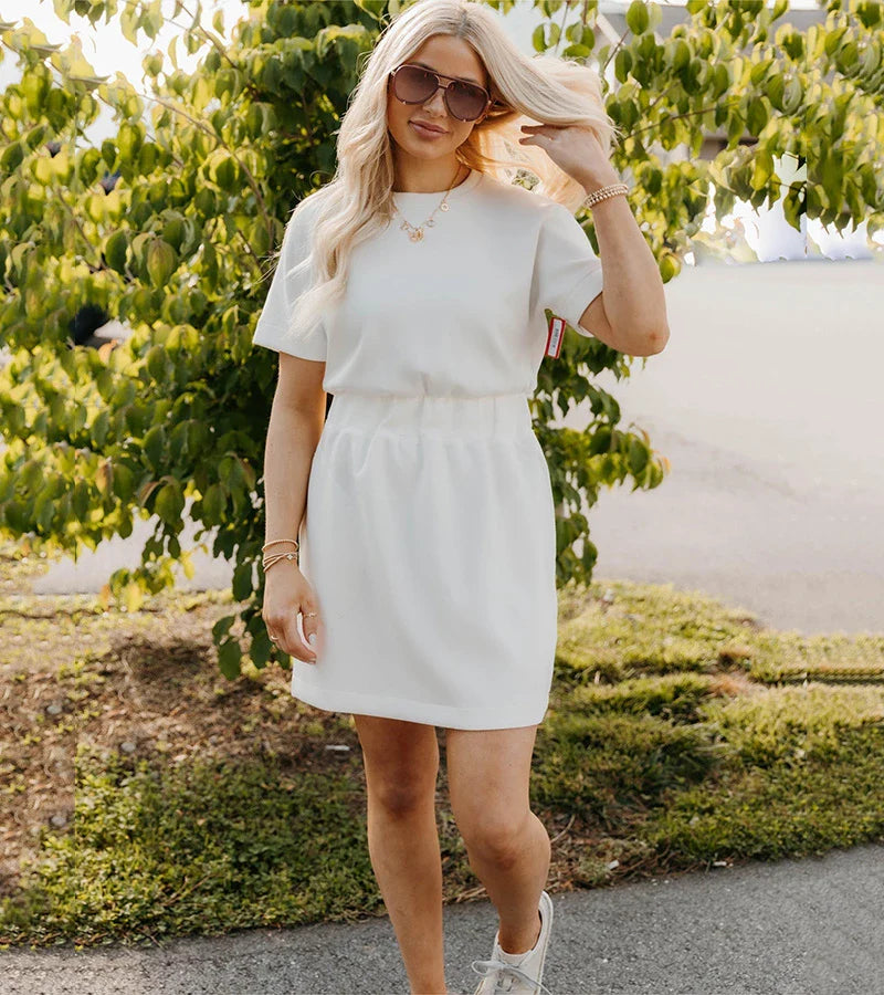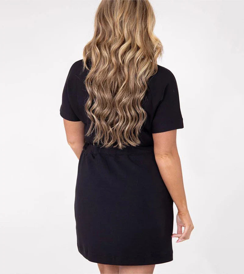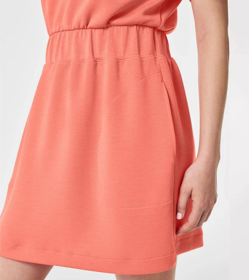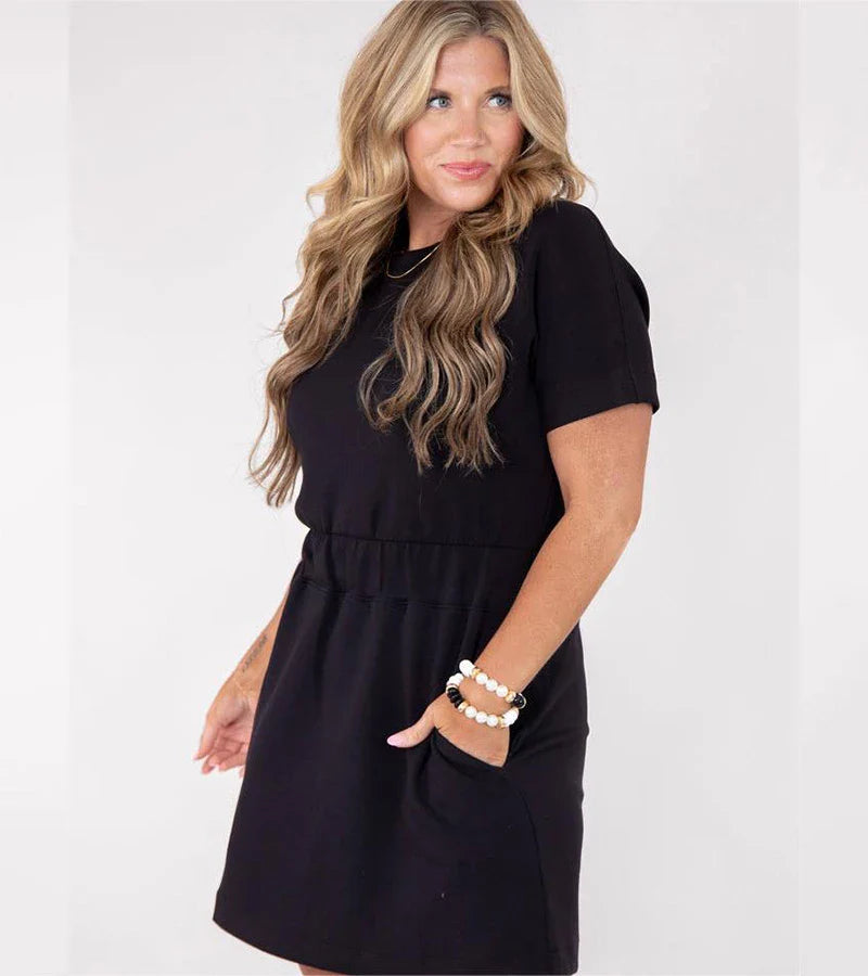 Comfort lussuoso da portare ovunque. Questo vestito a maniche corte è dotato di una cintura elastica nascosta che valorizza la tua silhouette, oltre a pratiche tasche frontali discrete.