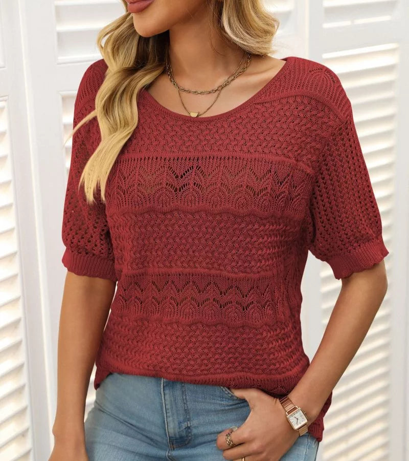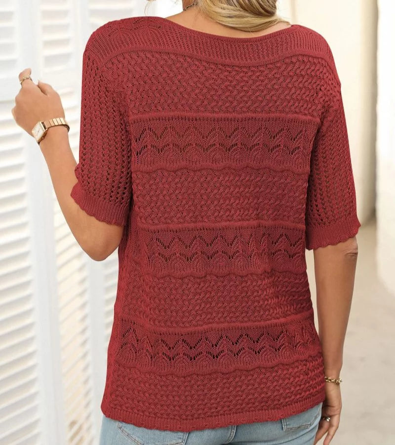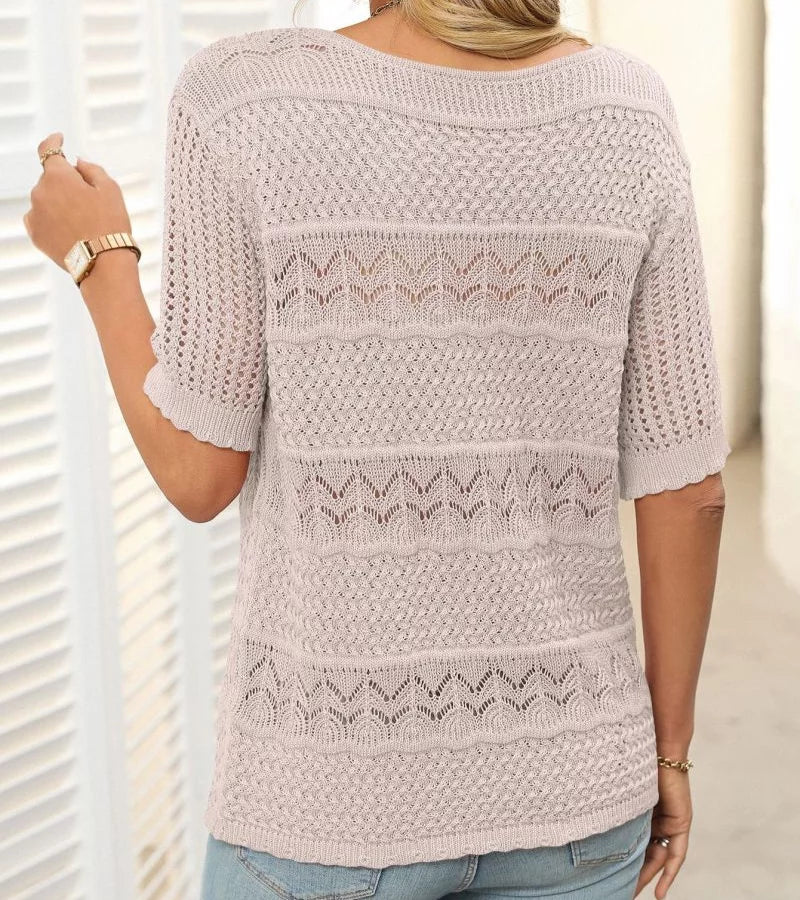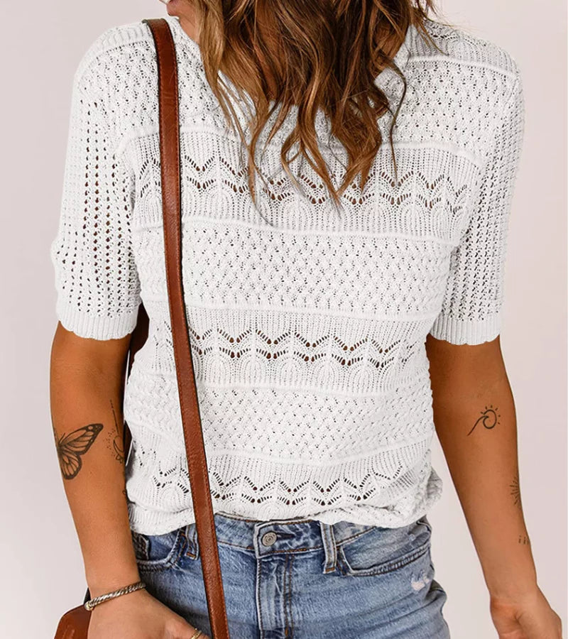 Lasciati conquistare da questo maglione in morbido cotone, lavorato a maglia traforata, perfetto per la mezza stagione e le giornate estive.