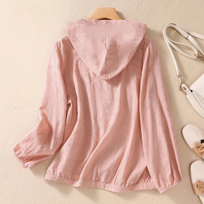 Il cappuccio, delicatamente strutturato, aggiunge un tocco moderno senza appesantire la silhouette, mentre il taglio fluido e rilassato si abbina con naturalezza a qualsiasi outfit — dai pantaloncini in lino ai pantaloni ampi, fino al vestito estivo.