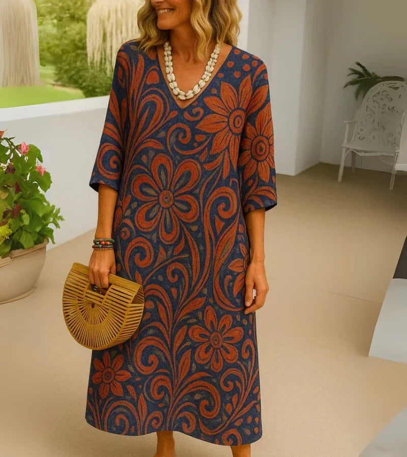 Con i suoi colori vivaci e le grandi stampe floreali, questo abito non passa inosservato e ti accompagna con stile e comodità in ogni momento della giornata.