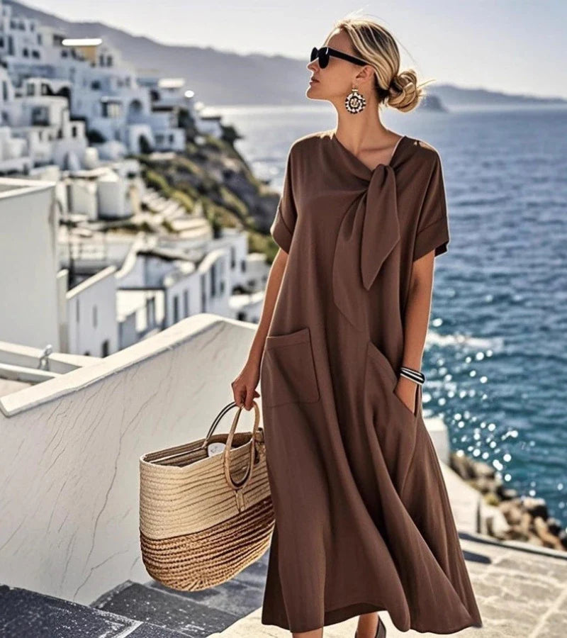 Immergiti nell’eleganza rilassata con questo abito fluido dal fascino mediterraneo.