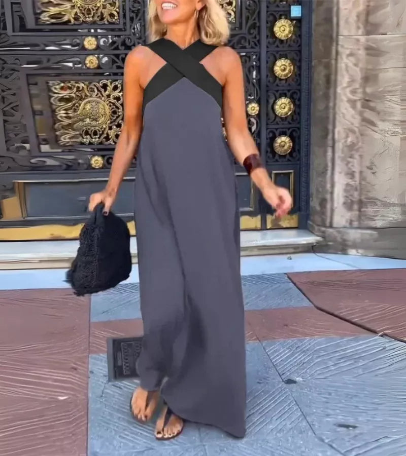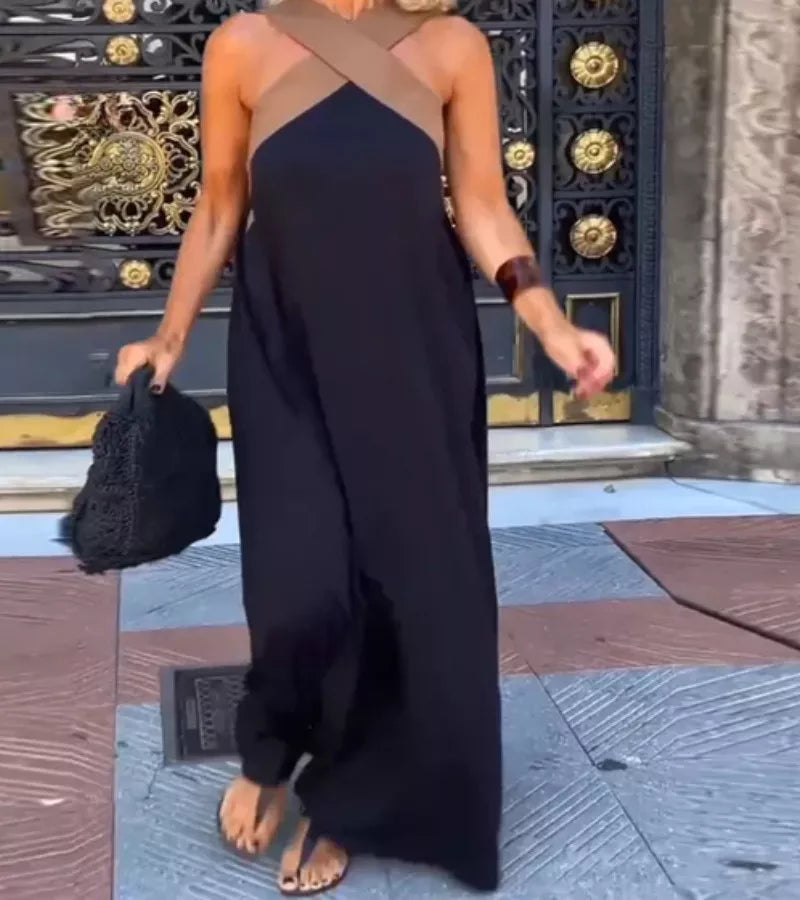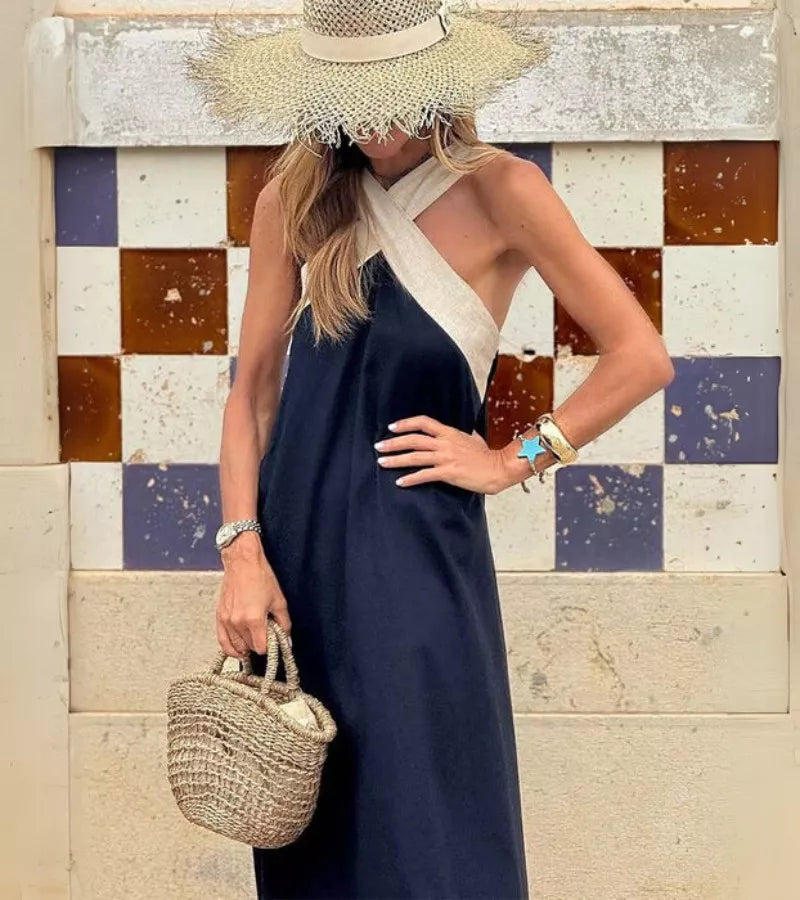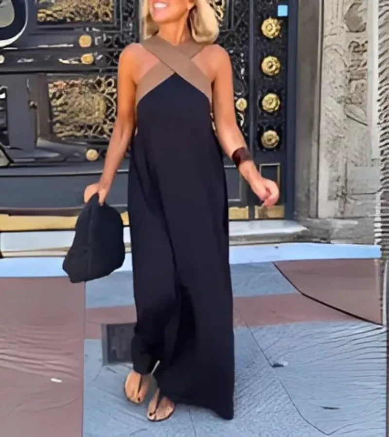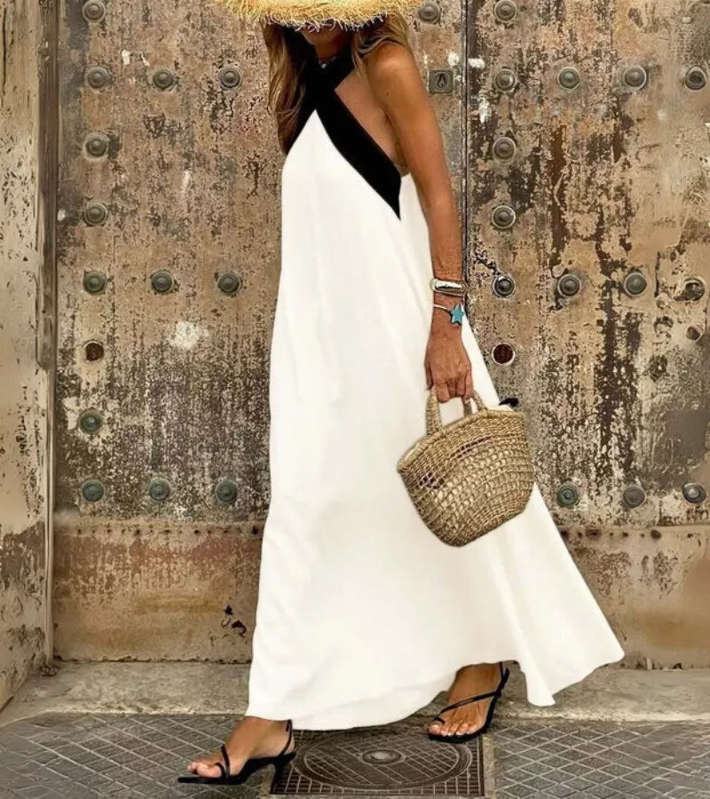 Lasciati conquistare da questo abito lungo con schiena incrociata, il perfetto alleato per un look estivo rilassato ma sofisticato. La sua linea fluida e il contrasto moderno dei colori donano un’eleganza naturale, senza rinunciare al comfort. Perfetto per una passeggiata sul lungomare, un pranzo all’aperto o una fuga in città: questo abito si adatta ad ogni occasione.