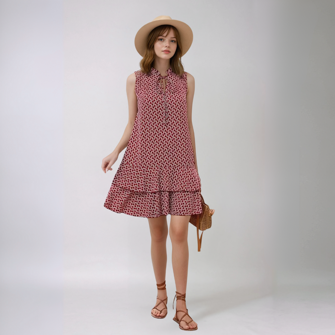 C’è qualcosa in Carolina™ che ti cambia l’umore. È quell’abito che indossi in un attimo e ti fa sentire subito in ordine, fresca e più sicura. Il taglio corto che accarezza le gambe, il tessuto leggero che si muove con te, e quel motivo geometrico che non stanca mai: elegante, ma con personalità.
